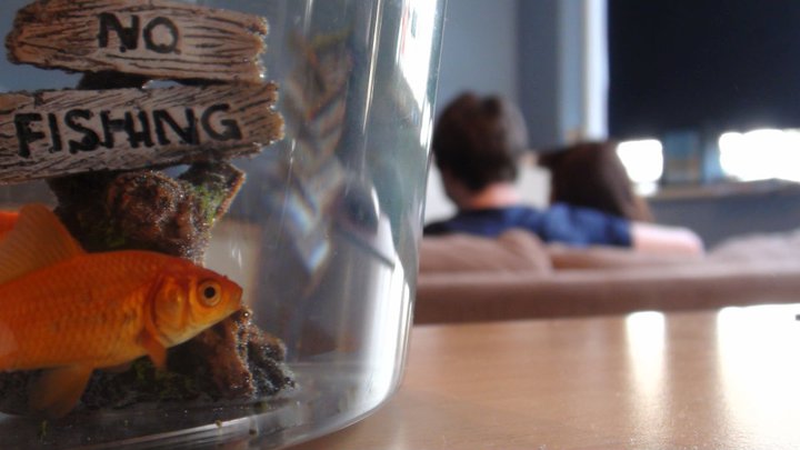 These three images are ones that we took whilst coming to the end of our filming, they were just after we had filmed the last scene and the position of the fish bowl in relationship to the two characters really appealed to me, therefore; I decided to take a picture and thought we might be able to use it as a poster idea and maybe use it for our final poster. I have made the image below bigger than the others as this is one we as a group, all really liked. After looking at the image and discussing it with our teachers wedecided that we would use the 'No Fishing' sign in the fish bowl as the title of our film. This would allow us to work closely with the image and work around successfully with the title. The text type on the sign is perfect and what we would of wanted to achieve, we are hoping to find a type similar to this so we can add various sections to the poster and therefore make it more appealing to the audience.